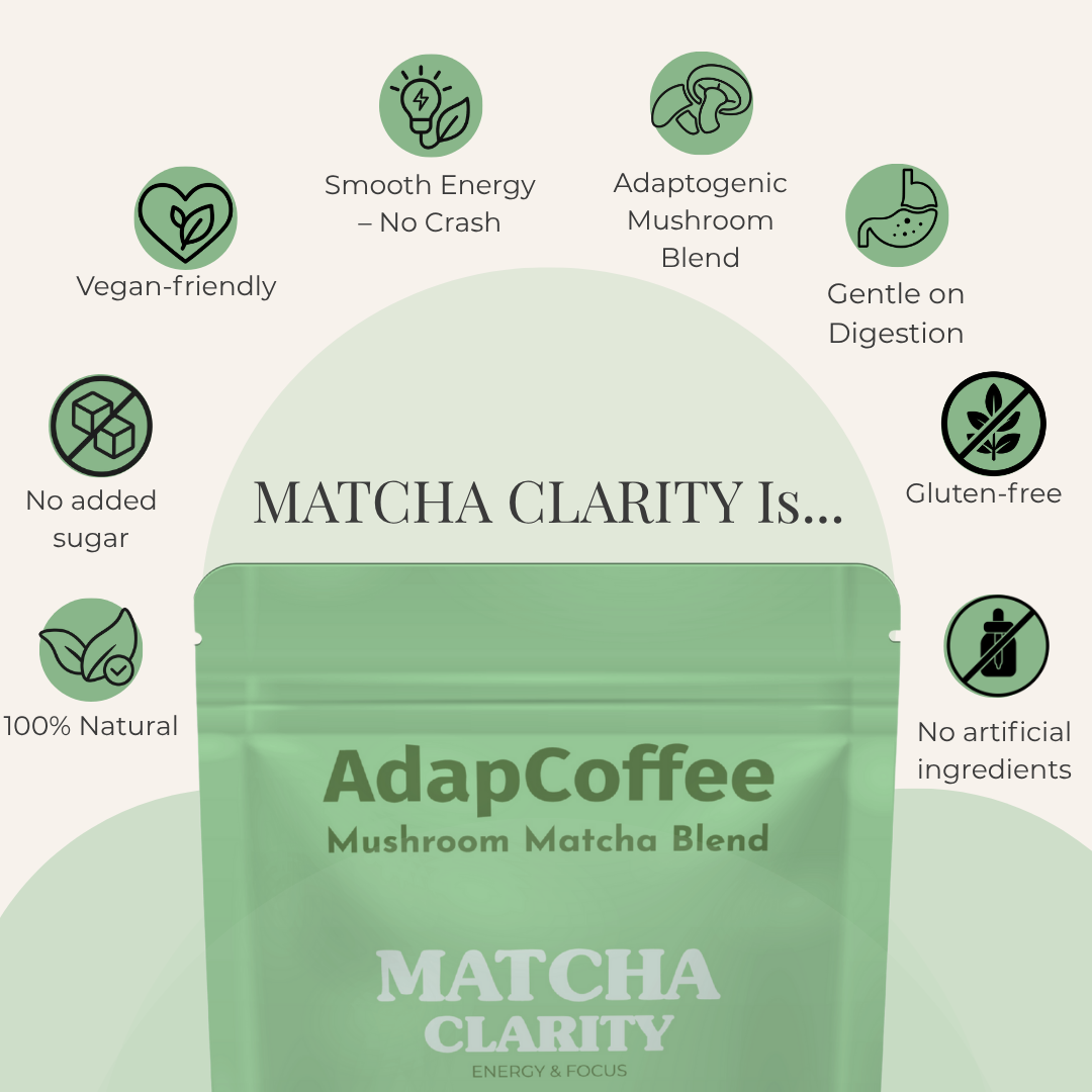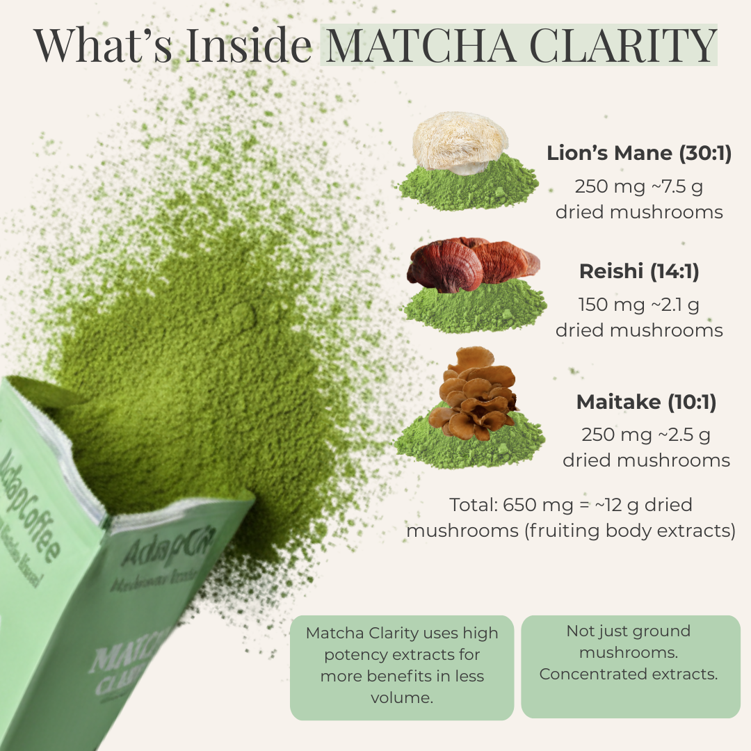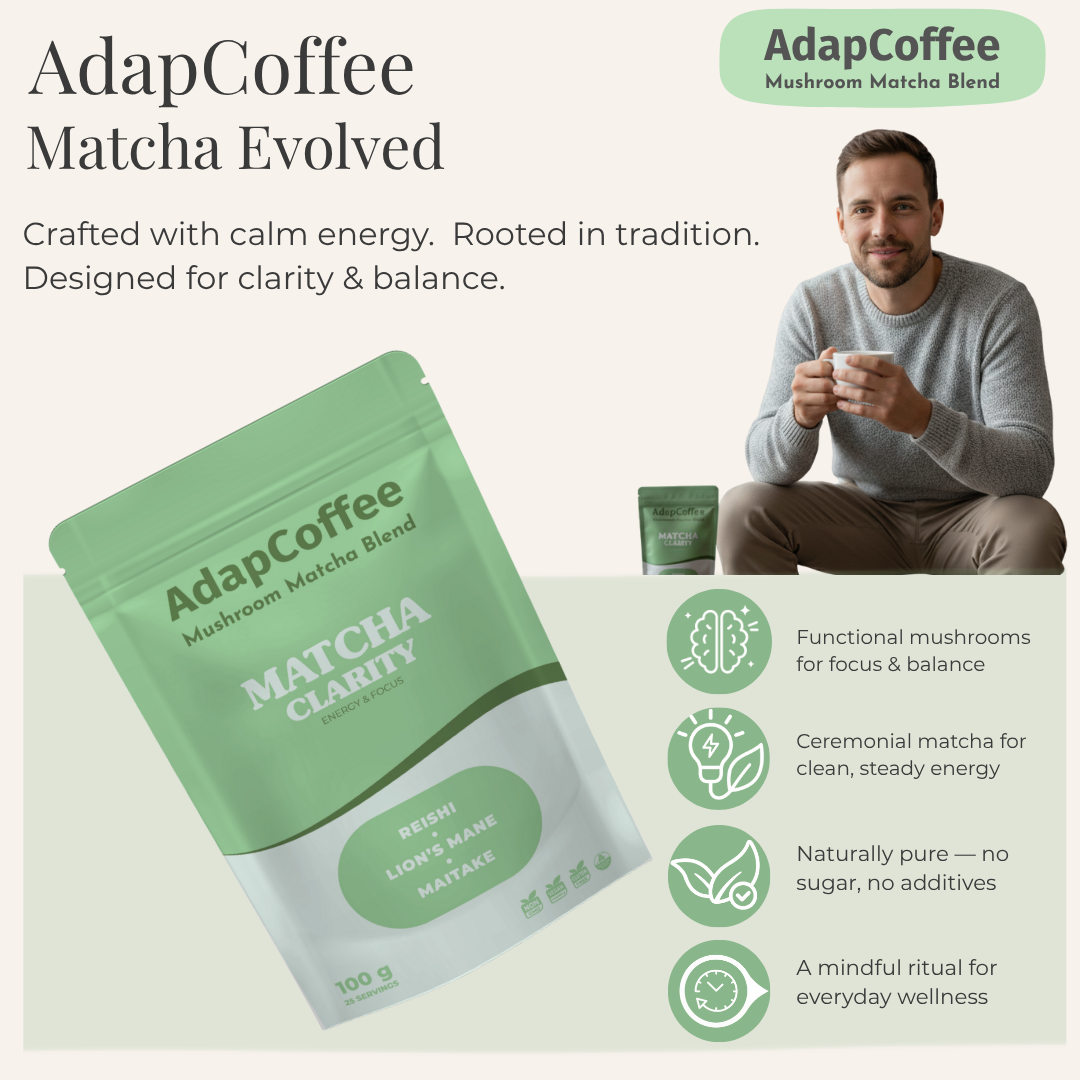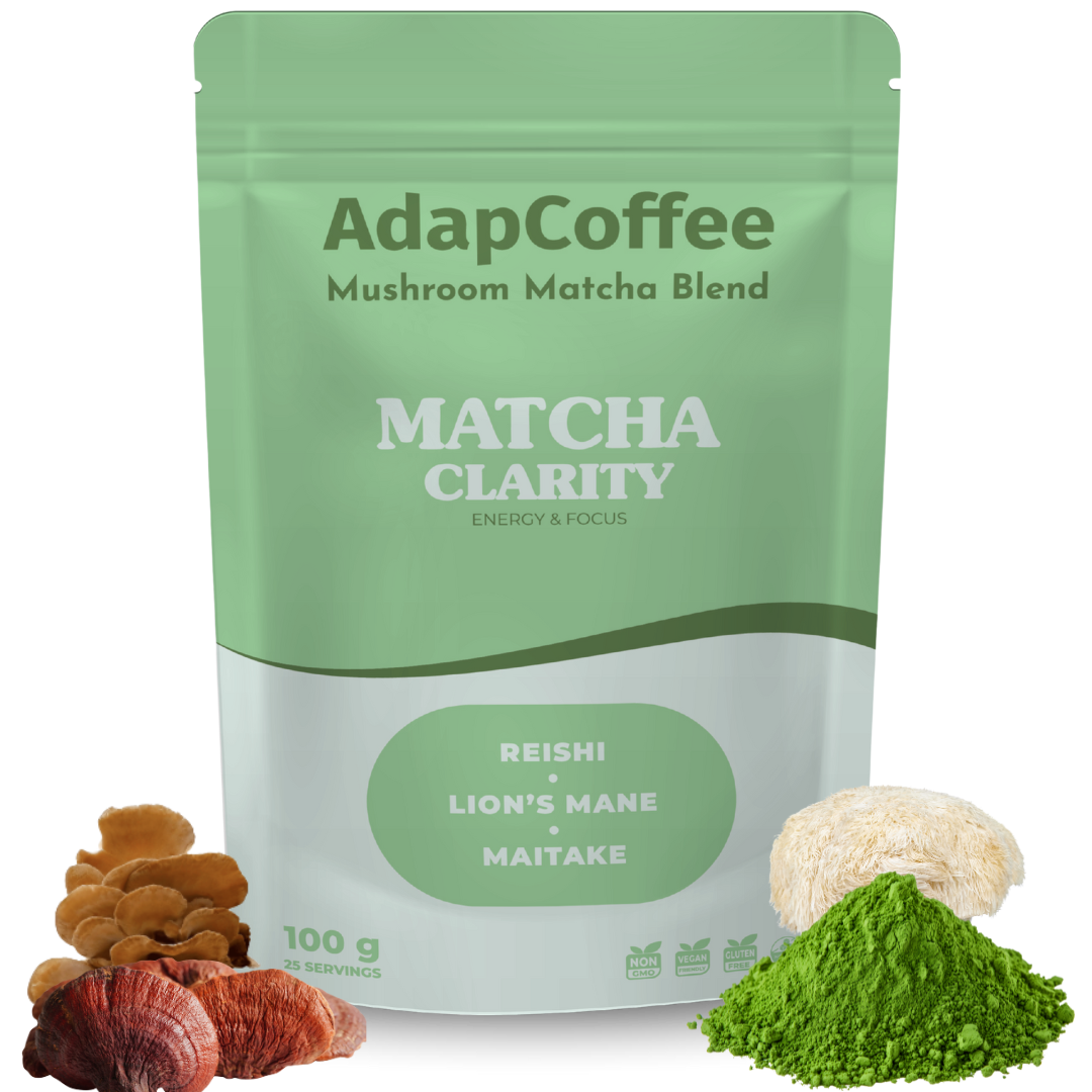 Gracias a su matcha ceremonial y a sus extractos de hongos adaptógenos, Matcha Clarity de AdapCoffee: