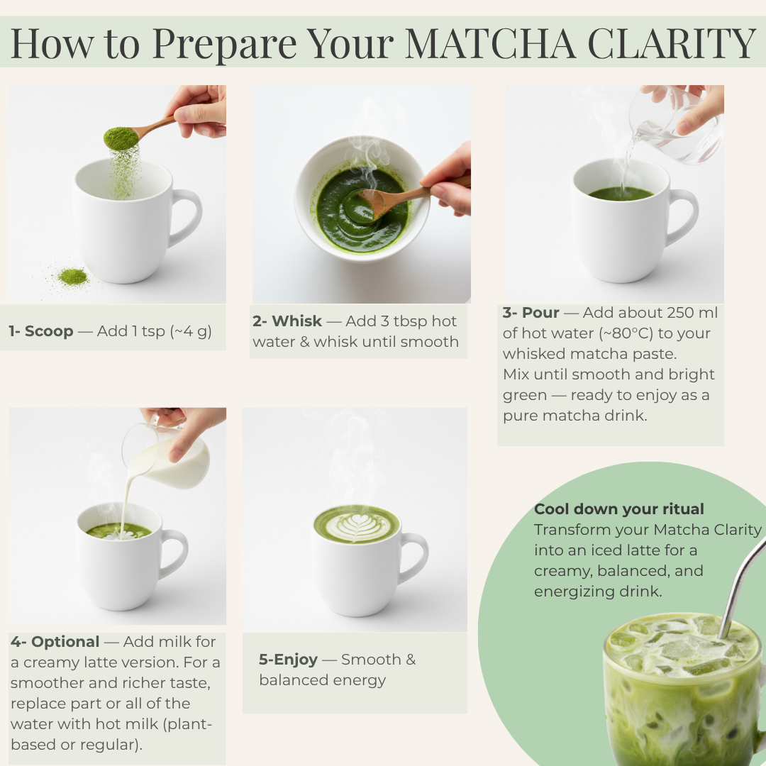 Añada 1 cucharada colmada (~4 g) en su taza. Vierta de 250 a 300 ml de agua caliente o fría – también es delicioso en versión helada. Mezcle simplemente con una cuchara o use un espumador de leche para una textura aún más cremosa. Disfrútelo tal cual, o añada leche (vegetal o no) y un toque de miel, sirope de agave o stevia. Una taza al día es suficiente para hacer de Clarity Cup su ritual de bienestar favorito.